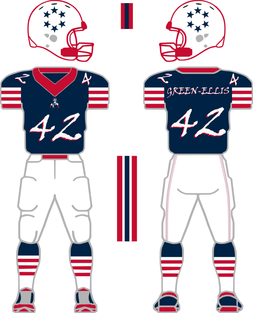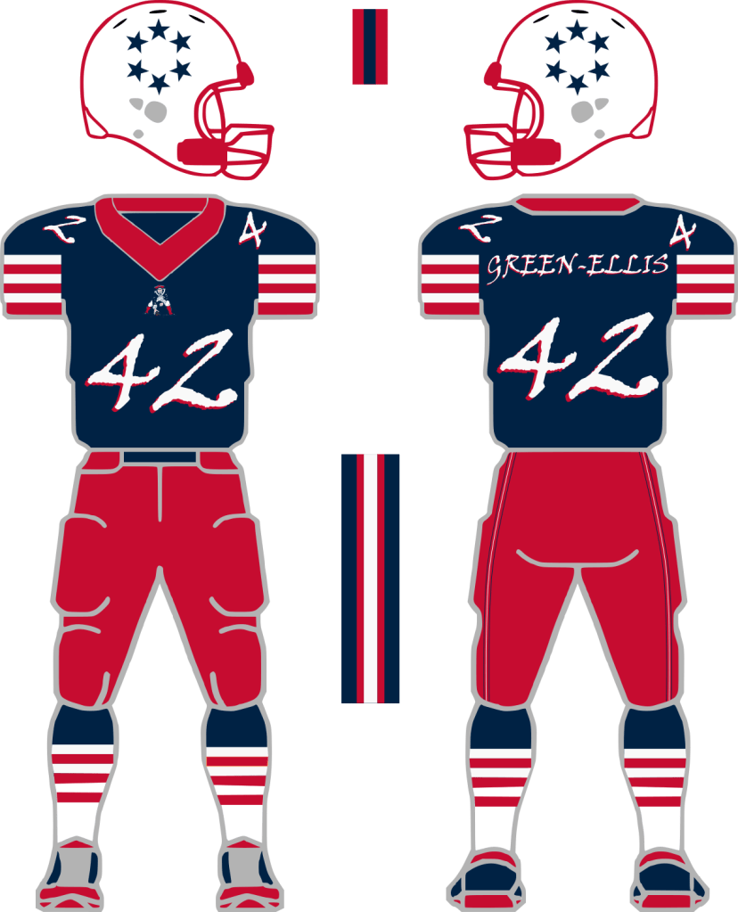 The alternate uniform is an updated take on the classic 1980s Patriots uniform. The helmet features the updated Pat Patriot logo with the red-blue-red stripes and reg facemask. The TV numbers are moved from the shoulders to the sleeves, and the shoulders feature the classic stripes. The colors, though, have been updated to the current color palette. Another deviation from the classic uniforms is the employment of a block font for the numbers and the names, again featuring a subtle drop shadow as a tie to the Bledsoe Era unis.